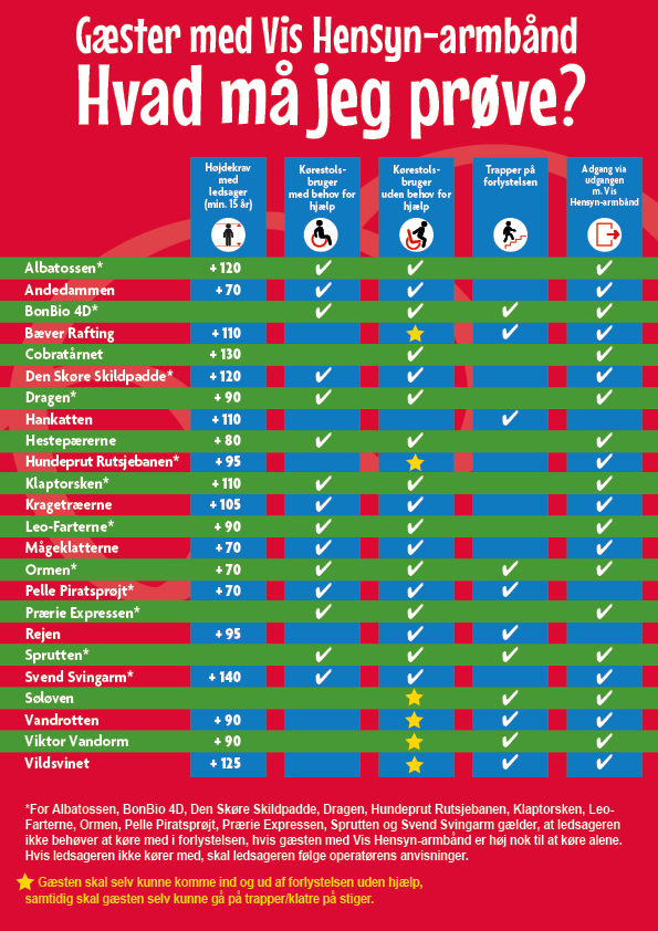 Vis Hensyn-armbåndet giver dig mulighed for at tage op til 4 ledsagere med Vis Hensyn-armbånd med i forlystelserne.